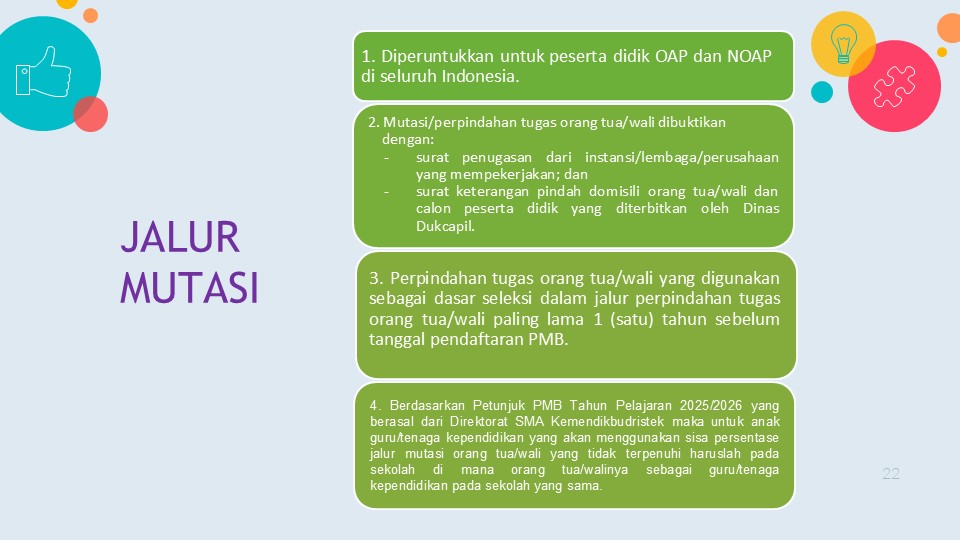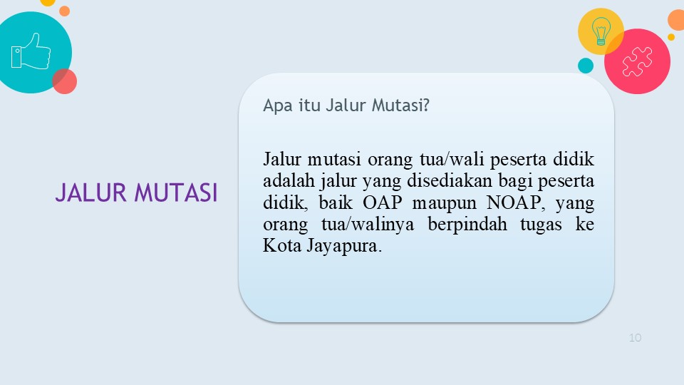 Jalur mutasi orang tua/wali peserta didik adalah jalur yang disediakan bagi peserta didik, baik OAP maupun NOAP, yang orang tua/walinya berpindah tugas ke Kota Jayapura.