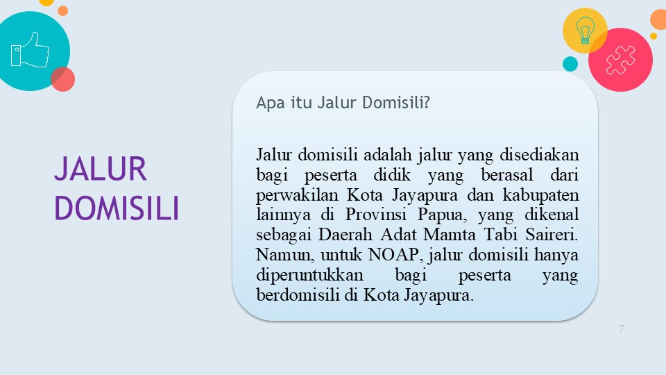 Jalur domisili adalah jalur yang disediakan bagi peserta didik yang berasal dari perwakilan Kota Jayapura dan kabupaten lainnya di Provinsi Papua, yang dikenal sebagai Daerah Adat Mamta Tabi Saireri. Namun, untuk NOAP, jalur domisili hanya diperuntukkan bagi peserta yang berdomisili di Kota Jayapura.